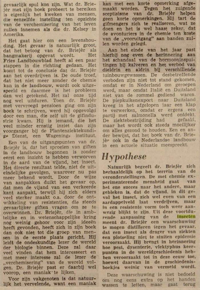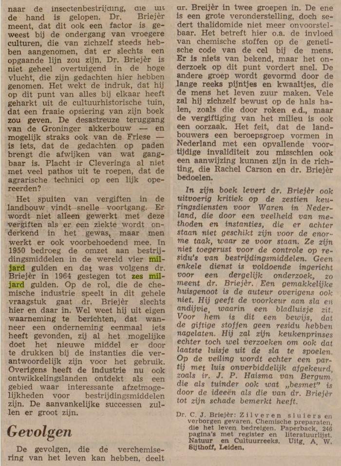 Het gaat hier om een levenshouding. Het gevaar is natuurlijk groot, dat het betoog van dr. Briejèr als bangmakerij opgevat wordt. Het Fries Landbouwblad heeft al een paar stappen in die richting gedaan. Het komt tot de conclusie dat dr. Briejèr aan het overdrijven is. De oude troef, dat het niet meer zonder de chemie kan in de landbouw, wordt ook uitgespeeld en daarmee is het probleem dan wel getekend. Het zal onze tijd nog wel uitduren. Toen dr. Briejèr met vervroegd pensioen ging om zijn boek te schrijven, werd hij opgevolgd door een man, die zelf uit de gifindustrie kwam. Hij is iemand, die het veel minder ernstig inziet dan zijn voorganger bij de Plantenziektekundige Dienst, een Wagenings instituut.