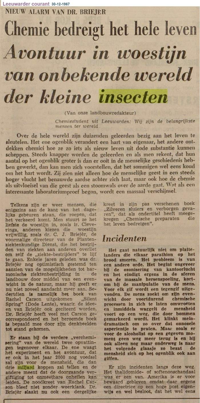 Telkens zijn er weer mensen, die enigszins aan de kant van het dagelijks gebeuren staan, die roepen, dat het verkeerd komt. Men stuurt ze het liefste de woestijn in, zoals ir. Cleveringa, anderen kiezen die woestijn vrijwillig, zoals dr. C. J. Briejèr, de voormalige directeur van de Plantenziektenkundige Dienst, die het bestrijden van ziekten aan anderen overliet om zelf de „ziekte-bestrijders” te lijf te gaan. Enkele jaren geleden was dr. Briejèr nog optimistisch gestemd ten aanzien van de mogelijkheden tot harmonische ziektenbestrijding in de landbouw door middel van een evenwicht in de natuur, maar hij geeft er nu niet zoveel aandacht meer aan. Sedertdien is namelijk het boek van Rachel Carson uitgekomen „Silent Spring" (Dode Lente), waarin de ideeën van Briejèr ook geciteerd worden. Dr. Briejèr heeft veel met Carson gecorrespondeerd en het beroemde boek, bepaald mee door zijn denkbeelden tot stand gekomen.