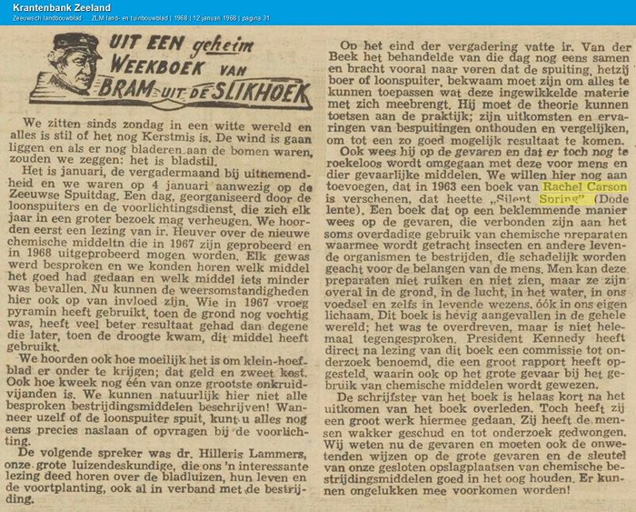 Het is januari, de vergadermaand bij uitnemendheid en we waren op 4 januari aanwezig op de Zeeuwse Spuitdag. Een dag, georganiseerd door de loonspuiters en de voorlichtingsdienst, die zich elk jaar in een groter bezoek mag verheugen. We hoorden eerst een lezing van ir. Heuver over de nieuwe chemische middelen die in 1967 zijn geprobeerd en in 1968 uitgeprobeerd mogen worden.