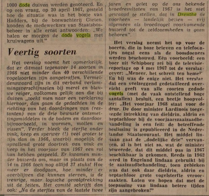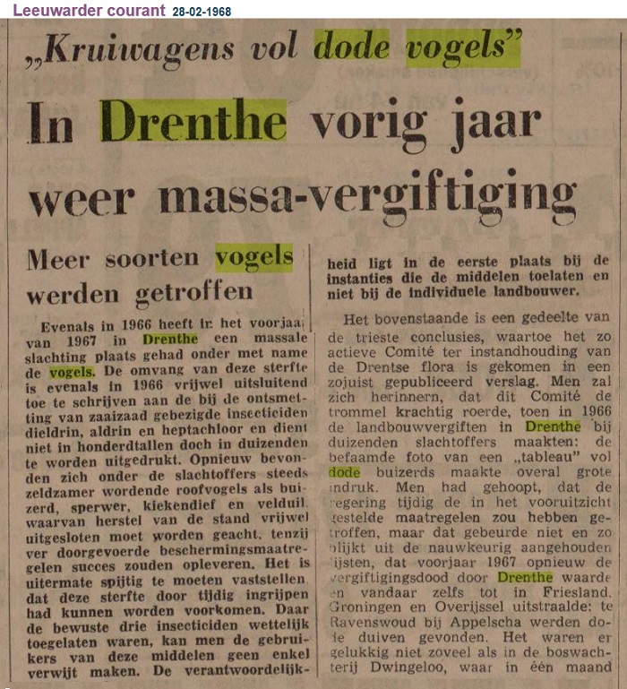 "„Kruiwagens vol dode vogels" In Drenthe vorig jaar weer massa-vergiftiging Meer soorten vogels werden getroffen". "Leeuwarder courant : hoofdblad van Friesland". Leeuwarden, 28-02-1968. Geraadpleegd op Delpher op 14-07-2019,