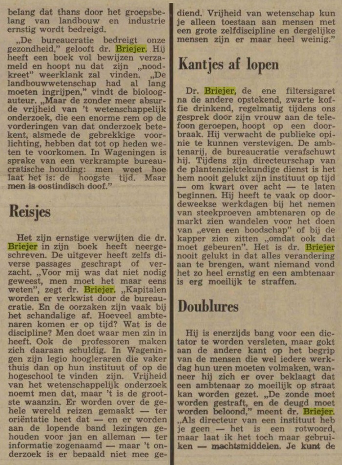 Dat men zich in Den Haag in de Kamer druk maakt over Phil Bloom en soldaten die een biertje in de trein drinken vindt dr. Briejer eigenlijk een trieste zaak. „Er zijn waarachtig wel belangrijker dingen om aan te pakken, zaken waarmee gezondheid en wetenschap zijn gemoeid. Over de zaak van de verontreiniging die alle Nederlanders nu méér dan ooit tevoren aangaat, bewaart men een stilzwijgen. Oorzaken: ambtenarij en bureaucratie. Alles duurt jaren. Niemand heeft haast. De landbouwhogeschool in Wageningen moet in 't geweer komen, maar daar glimlachen de hoogleraren alleen wat tegen elkaar.”
