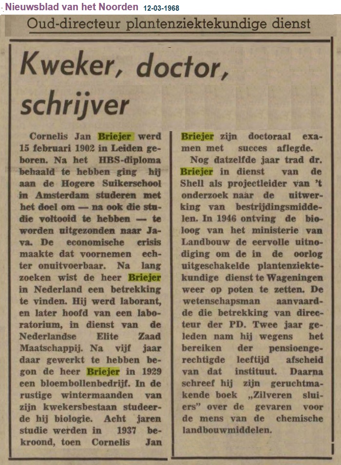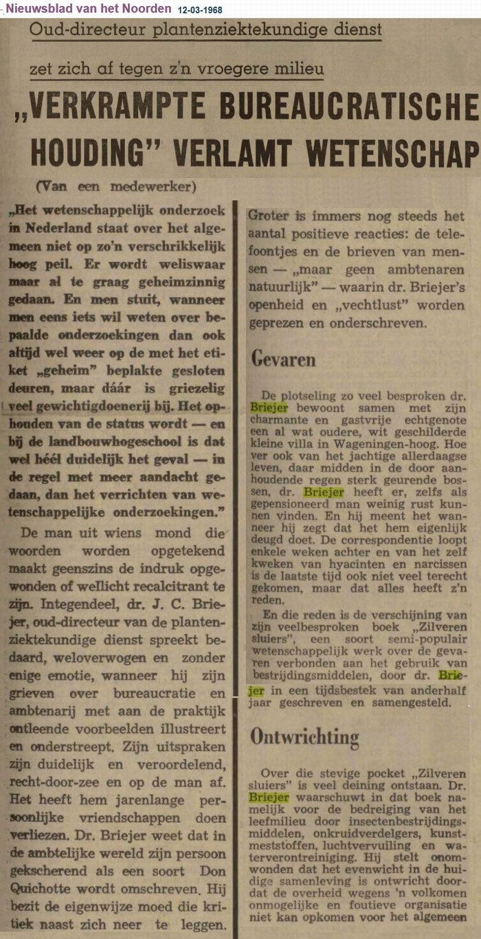 En die reden is de verschijning van zijn veelbesproken boek „Zilveren sluiers”, een soort semi-populair wetenschappelijk werk over de gevaren verbonden aan het gebruik van bestrijdingsmiddelen, door dr. Briejer in een tijdsbestek van anderhalf jaar geschreven en samengesteld.