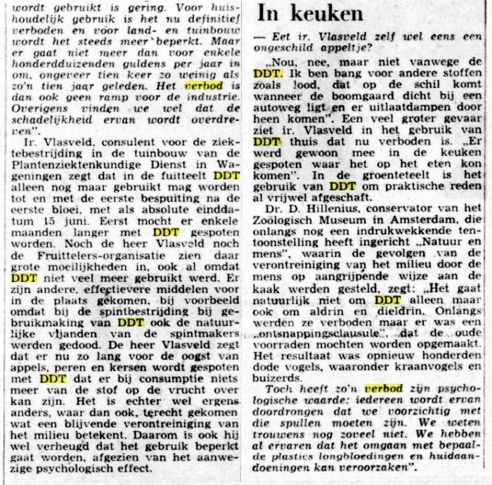 „Nou, nee, maar niet vanwege de DDT. Ik ben bang voor andere stoffen zoals lood, dat op de schil komt wanneer de boomgaard dicht bij een autoweg ligt; en er uitlaatdampen door heen komen”. Een veel groter gevaar ziet ir. Vlasveld in het gebruik van DDT- thuis dat nu verboden is. „Er werd gewoon mee in de keuken gespoten waar het op het eten kon komen”.- In de groenteteelt is het gebruik van DDT om praktische reden al vrijwel afgeschaft.