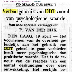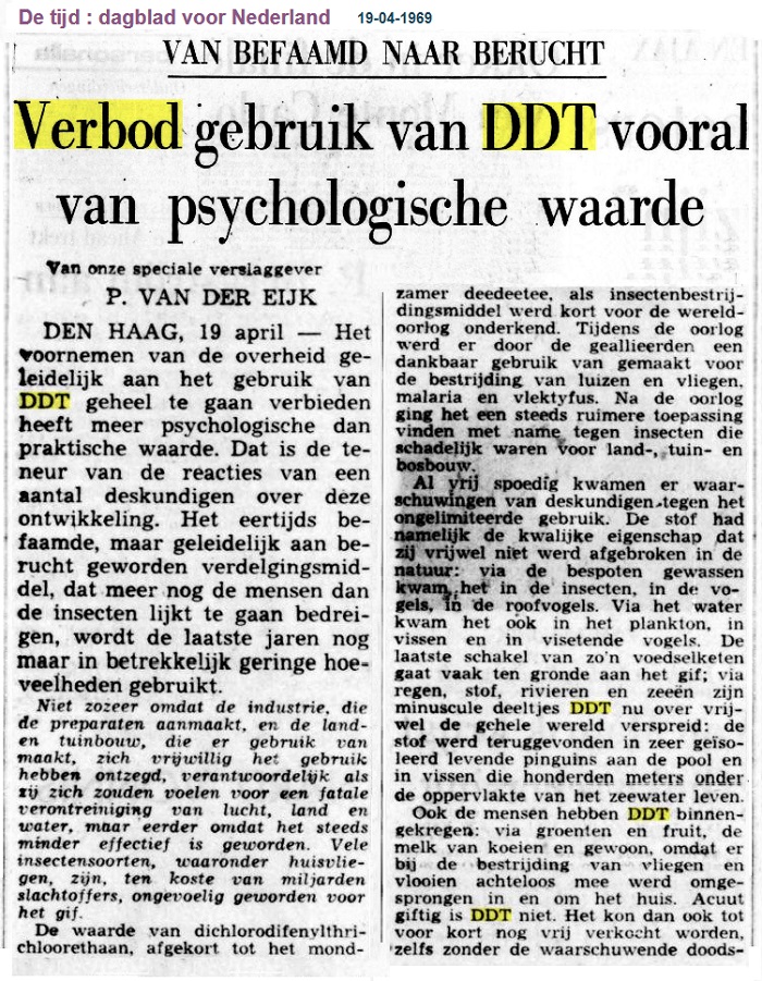 "VAN BEFAAMD NAAR BERUCHT Verbod gebruik van DDT vooral van psychologische waarde". "De tijd : dagblad voor Nederland". Amsterdam, 19-04-1969. Geraadpleegd op Delpher op 15-06-2019,