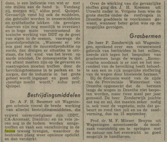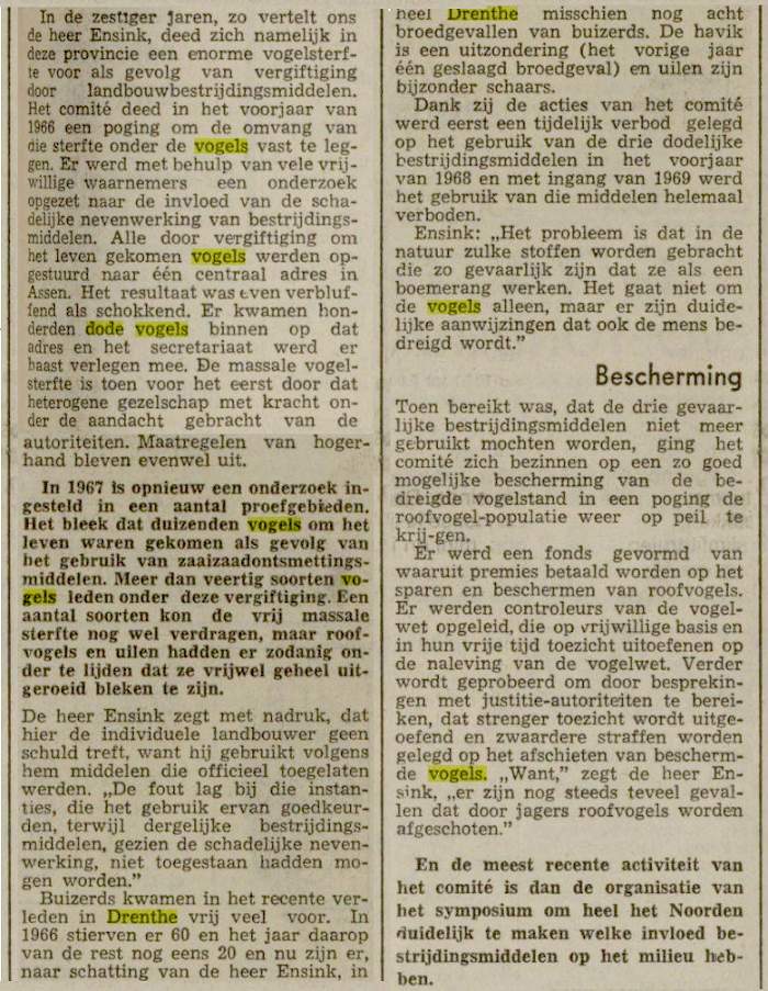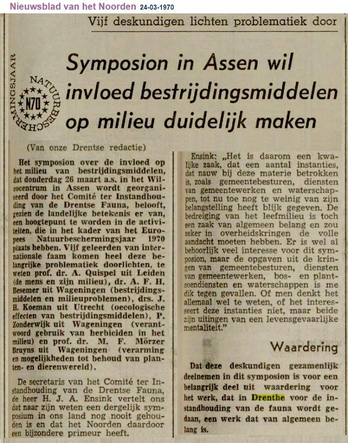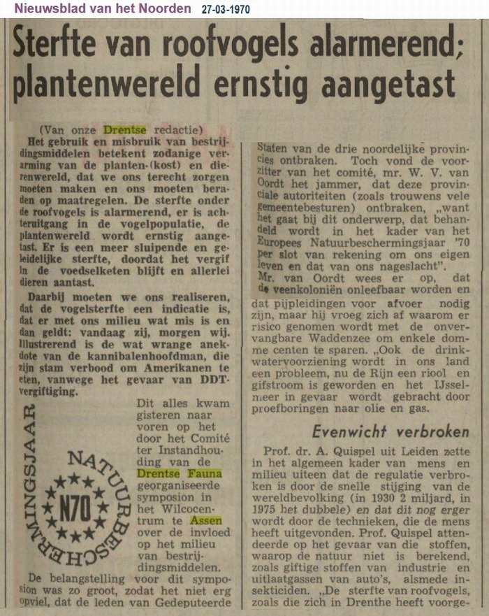 "Sombere conclusies op Symposion in Assen over bestrijdingsmiddelen Sterfte van roofvogels alarmerend; plantenwereld ernstig aangetast". "Nieuwsblad van het Noorden". Groningen, 27-03-1970. Geraadpleegd op Delpher op 15-07-2019, https://resolver.kb.nl/resolve?urn=ddd:011015739:mpeg21:a0285