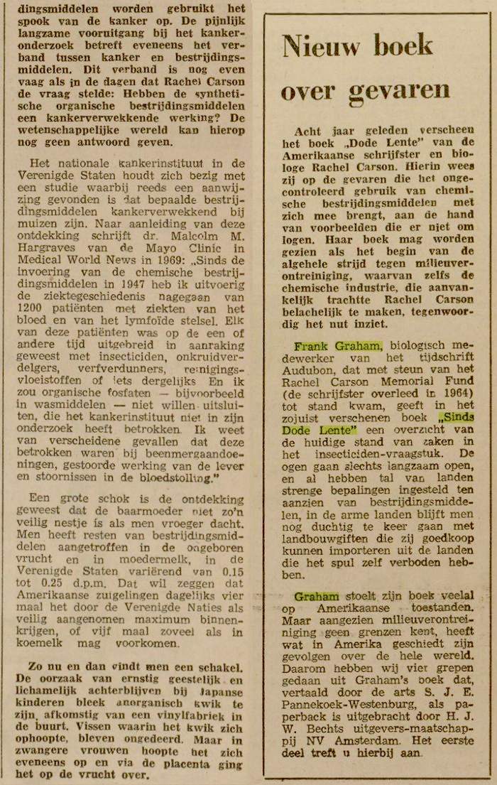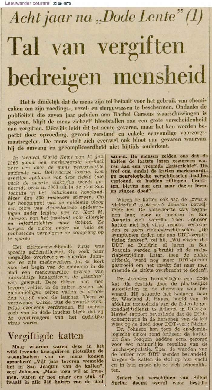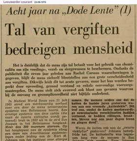 BRON: "Acht jaar na „Dode Lente" (1) Tal van vergiften bedreigen mensheid". "Leeuwarder courant : hoofdblad van Friesland". Leeuwarden, 23-09-1970. Geraadpleegd op Delpher op 04-06-2019, https://resolver.kb.nl/resolve?urn=ddd:010618555:mpeg21:a0210