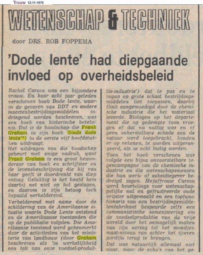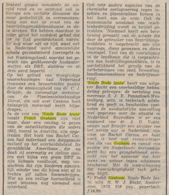 'Sinds Dode lente' heeft van uitgever Becht een voorbeeldige behandeling gekregen: de vertaling van mevrouw S. J. E. Pannakoek-Westenburg. arts. is technisch uitstekend en geeft in bescheiden voetnoten de noodzakelijke aanvulling met gegevens over de situatie in Nederland. Bovendien is er een nawoord van dr. A. D. Voute, samen met Briejèr een strijder van het eerste uur in Nederland, zijn visie op Rachel Carson en haar werk is heel wat evenwichtiger dan die van Graham en vanuit zijn positie als Nederlands deskundige geeft hij een gezaghebbend overzicht van het apparaat dat hier mens en natuur tegen uitwassen beschermt. Mét de waarschuwing dat voorzichtigheid toch geboden blijft.