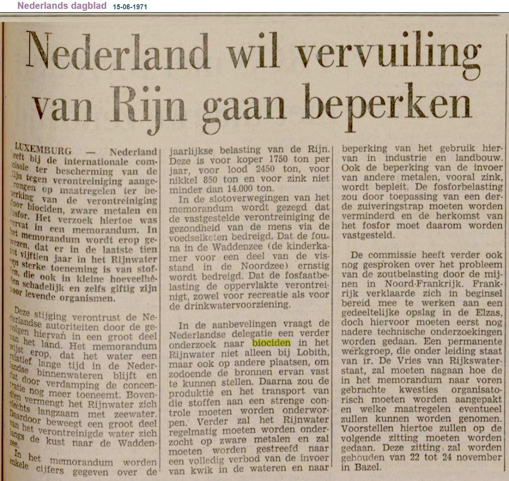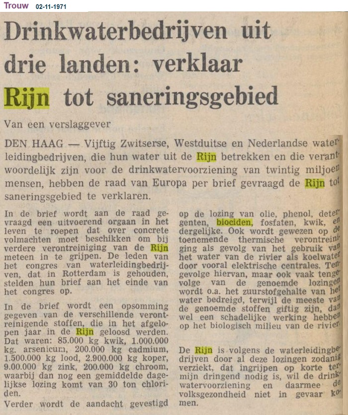 "Opnieuw actie tegen zoute Rijn". "NRC Handelsblad". Rotterdam, 19-11-1971. Geraadpleegd op Delpher op 25-06-2019, https://resolver.kb.nl/resolve?urn=KBNRC01:000032137:mpeg21:a0006