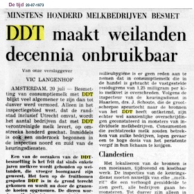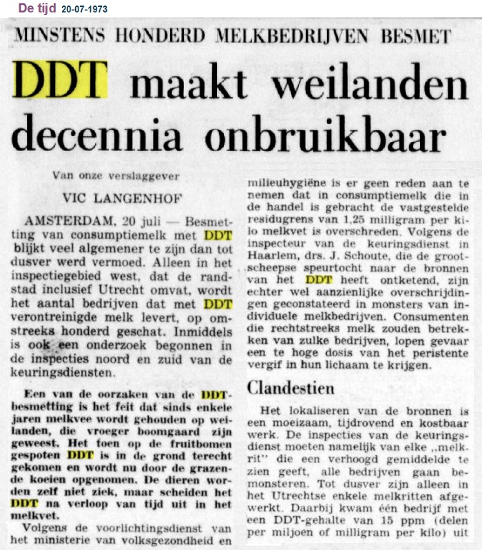 Volgens de voorlichtingsdienst van het ministerie van volksgezondheid en milieuhygiëne is er geen reden aan te nemen dat in consumptiemelk die in de handel is gebracht de vastgestelde residugrens van 1,25 milligram per kilo melkvet is overschreden. Volgens de inspecteur van de keuringsdienst in Haarlem, drs. J. Schoute, die de grootscheepse speurtocht naar de bronnen van het DDT heeft ontketend, zijn echter wel aanzienlijke overschrijdingen geconstateerd in monsters van individuele melkbedrijven. Consumenten die rechtstreeks melk zouden betrekken van zulke bedrijven, lopen gevaar een te hoge dosis van het peristente vergif in hun lichaam te krijgen.