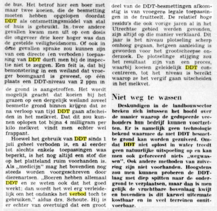 Hoewel het gebruik van DDT sinds 1 juli geheel verboden is, en al eerder tot slechts enkele toepassingen was beperkt, is het nog altijd een stof die op het platteland ruim voorhanden is. Als „medicijn” mag het bovendien nog steeds worden voorgeschreven door dierenartsen. „Boeren hebben allemaal DDT en ze weten ook dat het goed werkt; dan wordt het wel erg verleidelijk om het ondanks het verbod toch te gebruiken.” aldus drs. Schoute. Hij is er echter van overtuigd dat een groot deel van de DDT-besmettingen afkomstig is van vroegere legale toepassingen in de fruitteelt. De relatief hoge residu's die ook vorige jaren al in het Utrechtse gebied werden gevonden, zijn altijd op die manier verklaard. Dit jaar is het niveau plotseling scherp omhoog gegaan, hetgeen aanleiding is geworden voor het grootscheepse onderzoek. De plotselinge stijging zou het resultaat zijn van een proces, waarbij koeien geleidelijk DDT concentreren, tot het niveau is bereikt waarop ze het vergif gaan uitschelden in het melkvet.