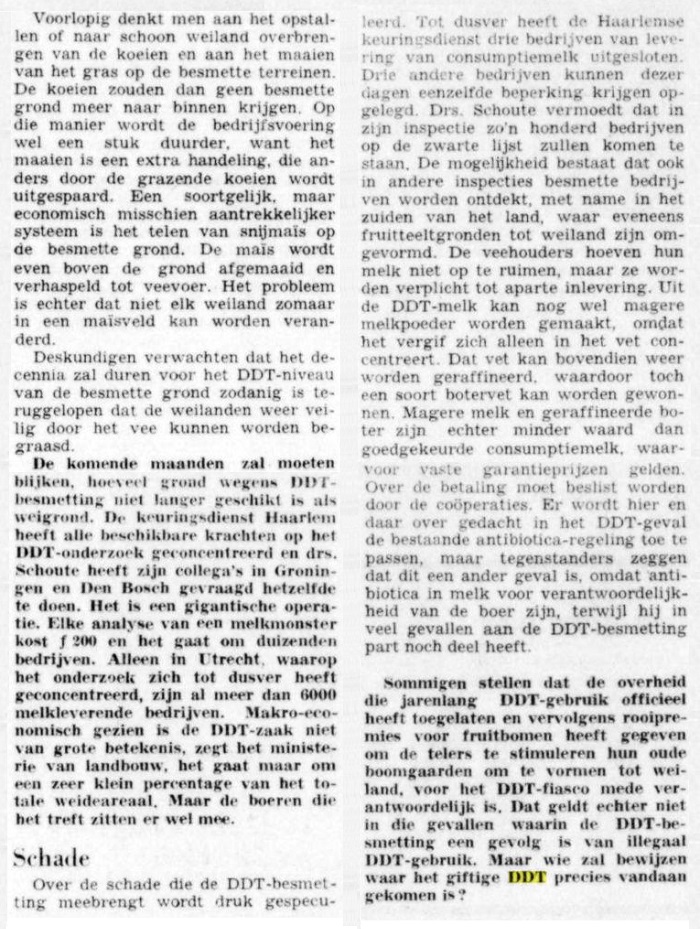 Over de schade die de DDT-besmetting meebrengt wordt druk gespeculeerd. Tot dusver heeft de Haarlemse keuringsdienst drie bedrijven van levering van consumptiemelk uitgesloten. Drie andere bedrijven kunnen dezer dagen eenzelfde beperking krijgen opgelegd. Drs. Schoute vermoedt dat in zijn inspectie zo'n honderd bedrijven op de zwarte lijst zullen komen te staan. De mogelijkheid bestaat dat ook in andere inspecties besmette bedrijven worden ontdekt, met name in het zuiden van het land, waar eveneens fruitteeltgronden tot weiland zijn omgevormd. De veehouders hoeven hun melk niet op te ruimen, maar ze worden verplicht tot aparte inlevering. Uit de DDT-melk kan nog wel magere melkpoeder worden gemaakt, omdat het vergif zich alleen in het vet concentreert. Dat vet kan bovendien weer worden geraffineerd, waardoor toch een soort botervet kan worden gewonnen. Magere melk en geraffineerde boter zijn echter minder waard dan goedgekeurde consumptiemelk, waarvoor vaste garantieprijzen gelden. Over de betaling moet beslist worden door de coöperaties. Er wordt hier en daar over gedacht in het DDT-geval de bestaande antibiotica-regeling toe te passen, maar tegenstanders zeggen dat dit een ander geval is, omdat antibiotica in melk voor verantwoordelijkheid van de boer zijn, terwijl hij in veel gevallen aan de DDT-besmetting part noch deel heeft.