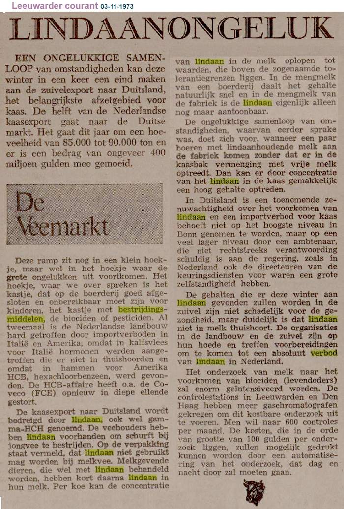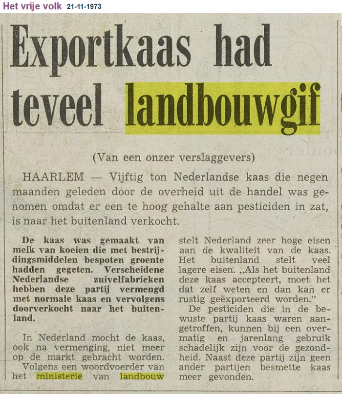 "Exportkaas had teveel landbouwgif". "Het vrije volk : democratisch-socialistisch dagblad". Rotterdam, 21-11-1973. Geraadpleegd op Delpher op 30-06-2019, https://resolver.kb.nl/resolve?urn=ddd:010958300:mpeg21:a0129