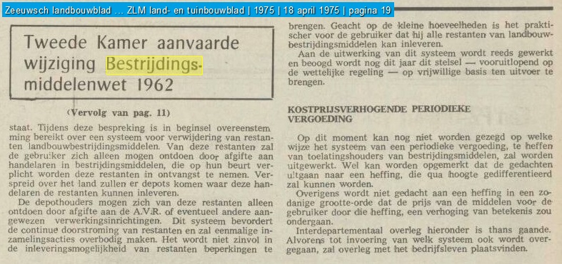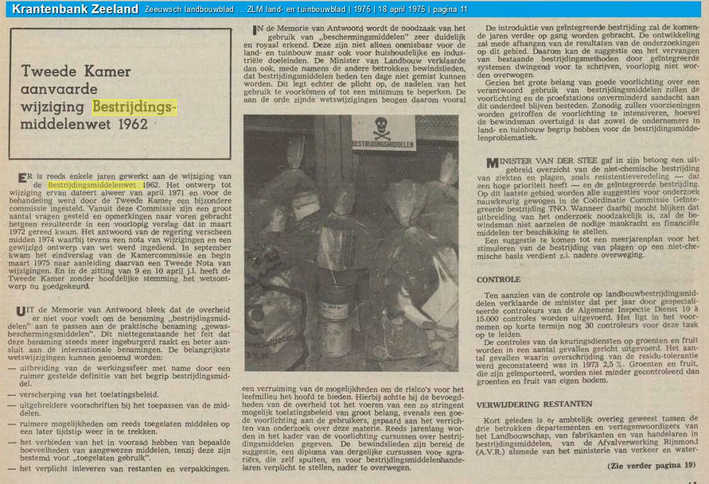 ER is reeds enkele jaren gewerkt aan de wijziging van de Bestrijdings-middelenwet 1962. Het ontwerp tot wijziging ervan dateert alweer van april 1971 en voor de behandeling werd door de Tweede Kamer een bijzondere commissie ingesteld. Vanuit deze Commissie zijn een groot aantal vragen gesteld en opmerkingen naar voren gebracht hetgeen resulteerde in een voorlopig verslag dat in maart 1972 gereed kwam. Het antwoord van de regering verscheen midden 1974 waarbij tevens een nota van wijzigingen en een gewijzigd ontwerp van wet werd ingediend. In september kwam het eindverslag van de Kamercommissie en begin maart 1975 naar aanleiding daarvan een Tweede Nota van wijzigingen. En in de zitting van 9 en 10 april j.l. heeft de Tweede Kamer zonder hoofdelijke stemming het wetsontwerp nu goedgekeurd.