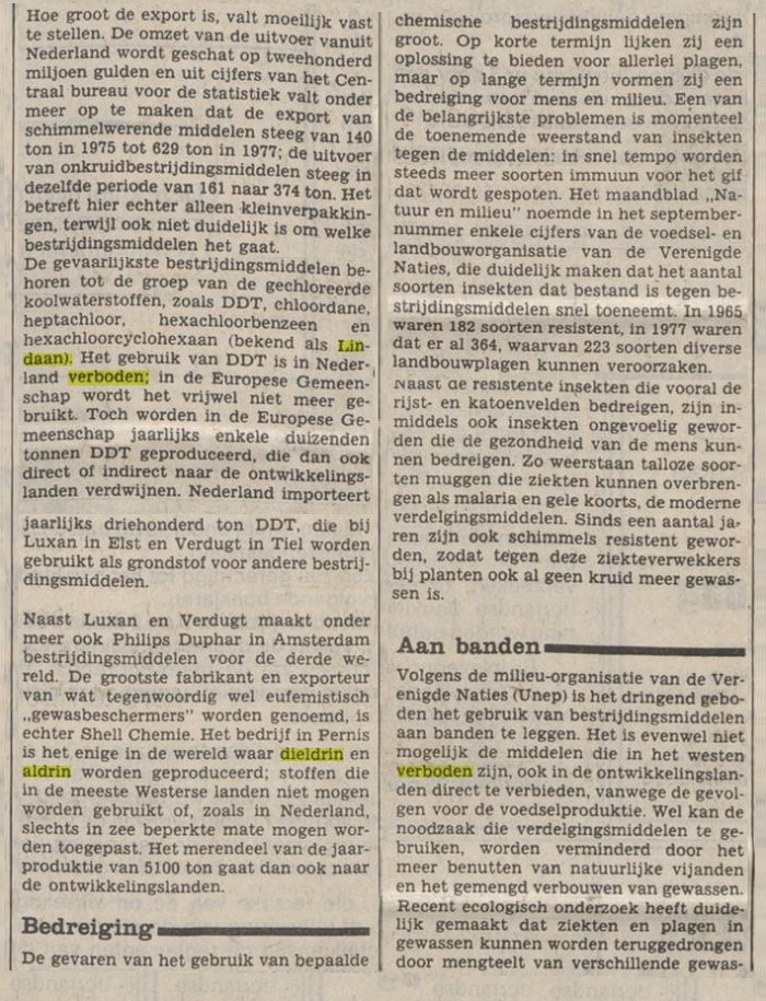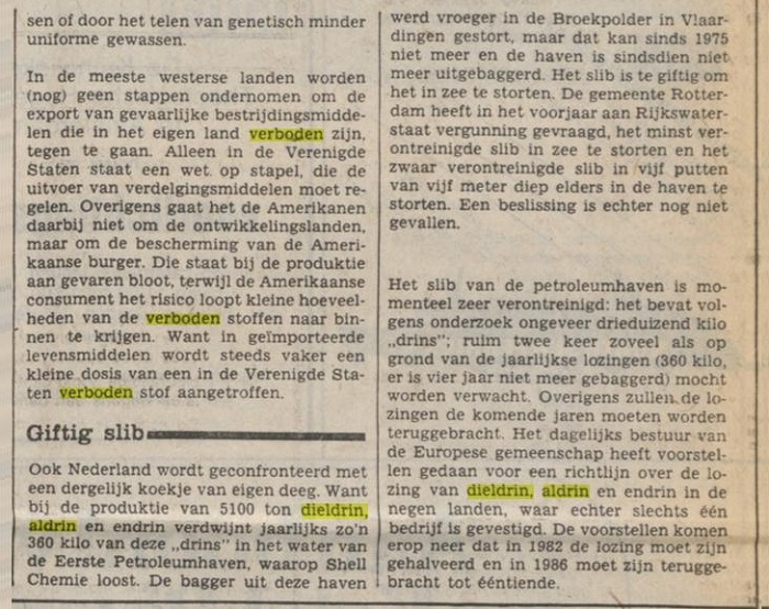 Naast Luxan en Verdugt maakt onder meer ook Philips Duphar in Amsterdam bestrijdingsmiddelen voor de derde wereld. De grootste fabrikant en exporteur van wat tegenwoordig wel eufemistisch „gewasbeschermers” worden genoemd, is echter Shell Chemie. Het bedrijf in Pernis is het enige in de wereld waar dieldrin en aldrin worden geproduceerd; stoffen die in de meeste Westerse landen niet mogen worden gebruikt of, zoals in Nederland, slechts in zee beperkte mate mogen worden toegepast. Het merendeel van de jaarproductie van 5100 ton gaat dan ook naar de ontwikkelingslanden.