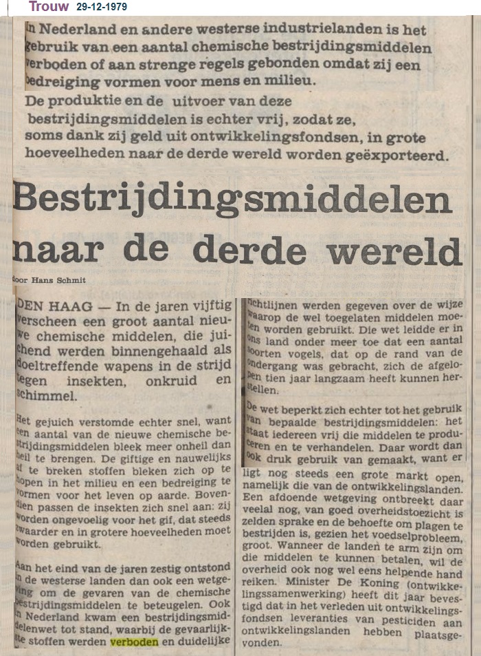 De produktie en de uitvoer van deze bestrijdingsmiddelen is echter vrij, zodat ze, soms dank zij geld uit ontwikkelings-fondsen, in grote hoeveelheden naar de derde wereld worden geëxporteerd.