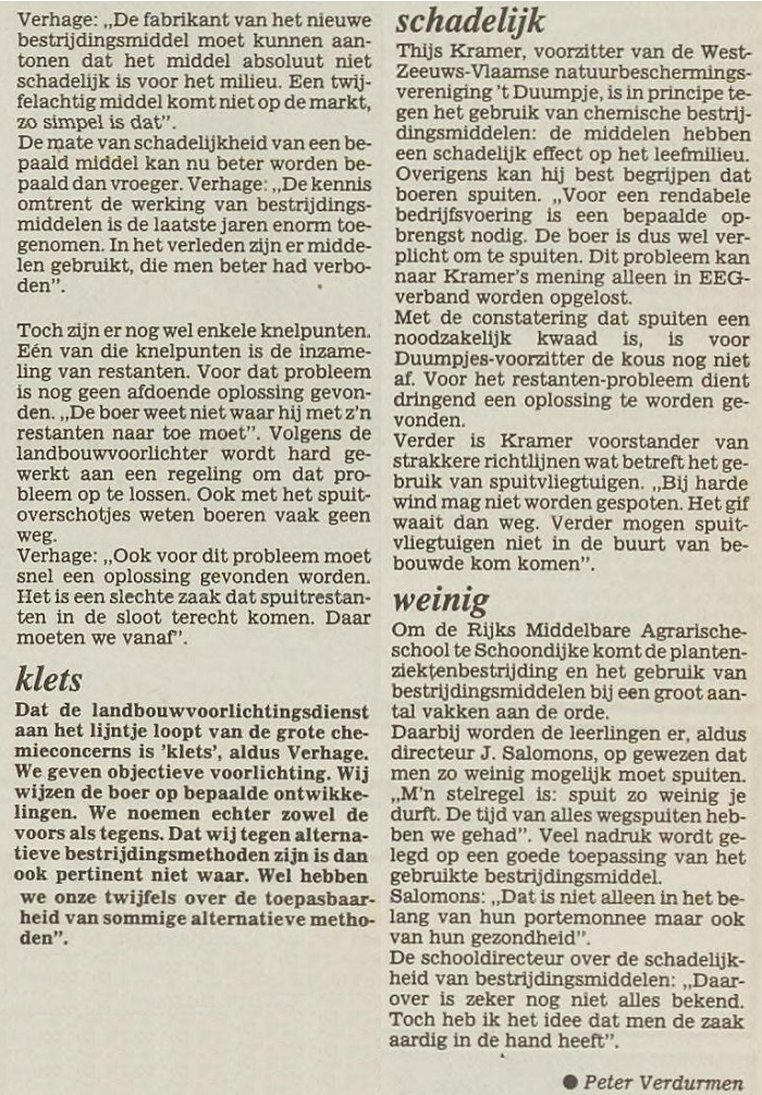 Thijs Kramer, voorzitter van de west-Zeeuws-Vlaamse natuurbeschermings vereniging 't Duumpje, is in principe tegen het gebruik van chemische bestrijdingsmiddelen: de middelen hebben een schadelijk effect op het leefmilieu. Overigens kan hij best begrijpen dat boeren spuiten. „Voor een rendabele bedrijfsvoering is een bepaalde opbrengst nodig. De boer is dus wel verplicht om te spuiten. Dit probleem kan naar Kramer's mening alleen in EEG -verband worden opgelost.