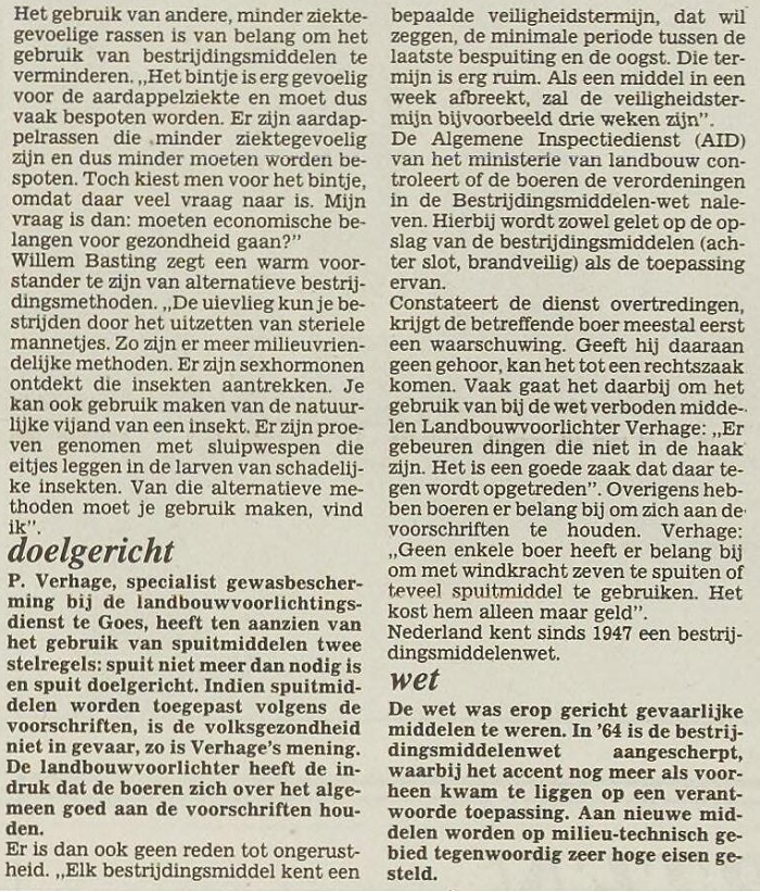 Boeren spuiten vaak onnodig, meent Willem Basting. „Als ze om half één bij het nieuws regen voorspellen, zie je vijf minuten later de spuitkarren door de polder rijden. Bij wijze van spreken dan. Is dat nodig, vraag ik me af'. De boer moet nog beter worden voorgelicht. „Een boer moet pas dan spuiten als het echt nodig is. Bovendien moet het middel goed worden toegepast. En ook daar ontbreekt het volgens mij nog wel eens aan”.