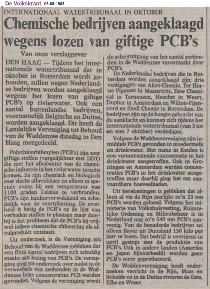"INTERNATIONAAL WATERTRIBUNAAL IN OKTOBER Chemische bedrijven aangeklaagd wegens lozen van giftige PCB's". "De Volkskrant". 's-Hertogenbosch, 03-08-1983. Geraadpleegd op Delpher op 23-06-2019, https://resolver.kb.nl/resolve?urn=ABCDDD:010878435:mpeg21:a0069