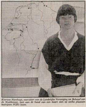 Dit heeft de Landelijke Vereniging tot Behoud van de Waddenzee dinsdag in Den Haag meegedeeld. Polychloorbüenylen (PCB's) zijn zeer giftige stoffen (vergelijkbaar met DDT) die met het afvalwater van de chemische industrie in het rivierwater terecht komen. Ze zijn chemisch en biologisch zeer slecht afbreekbaar en alleen in speciale ovens bij een temperatuur van 1100 graden Celsius te verbranden. PCB's zijn kankerverwekkend en schadelijk voor de voortplanting.