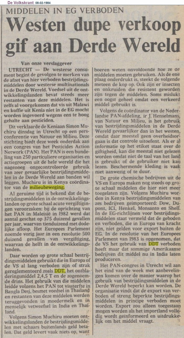 De grote chemische bedrijven uit de VS en Europa maken nog steeds op grote schaal middelen die hier niet meer toegelaten zijn. Volgens Muchiru worden in Kenya bestrijdingsmiddelen van zes bedrijven geimporteerd: Dow, Dupont, ICI, Henkei, Monsanto en Shell. In de EG-richtlijnen voor bestrijdingsmiddelen staat vermeld dat de geboden en verboden, die in Europa van kracht zijn, niet gelden voor export buiten de EG. In de resolutie van het Europees Parlement van 1983 is opgenomen, dat de VS het gebruik van DDT verboden heeft maar dat sommige Amerikaanse bedrijven dit middel nu in India laten produceren.