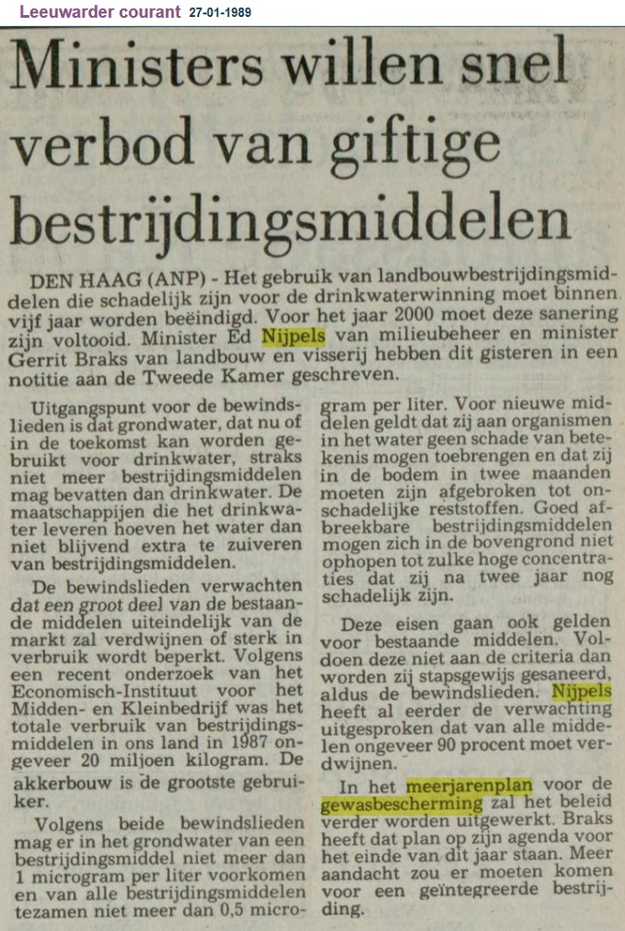 "Ministers willen snel verbod van giftige bestrijdingsmiddelen". "Leeuwarder courant : hoofdblad van Friesland". Leeuwarden, 1989/01/27 00:00:00, p. 3. Geraadpleegd op Delpher op 04-10-2019, http://resolver.kb.nl/resolve?urn=ddd:010566870:mpeg21:p003