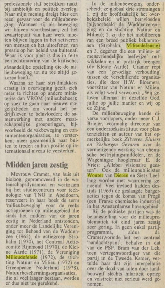 En verder: „Op het moment is zeker niet waarneembaar dat de milieubeweging, nu ze zoveel positiever tegemoet wordt getreden, zich laat inpakken. In de meeste publicaties van de diverse actiegroepen worden juist wat radicalere uitspraken gedaan dan de laatste jaren gebruikelijk was.”