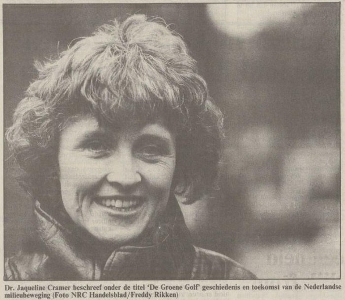 Dr. Cramer (37) beschreef zojuist onder de titel De Groene Golf geschie-denis en toekomst van de Nederlandse milieubeweging, waarin ze zelf jarenlang voorop liep, onder meer als voorzitter van de Vereniging Milieudefensie en van het Landelijk Milieu- overleg. Anderhalve week voor het boek bij de Utrechtse uitgeverij Jan van Arkel verschijnt, legt ze uit waar het haar om gaat: hoe kan de milieubeweging gebruik maken van de omslag in het 'milieudenken' zonder haar strijdbaarheid en identiteit te verliezen?