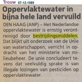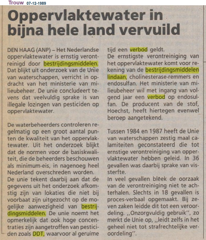 "Oppervlaktewater in bijna hele land vervuild". "Trouw". Meppel, 07-12-1989. Geraadpleegd op Delpher op 17-06-2019, https://resolver.kb.nl/resolve?urn=ABCDDD:010827205:mpeg21:a0138