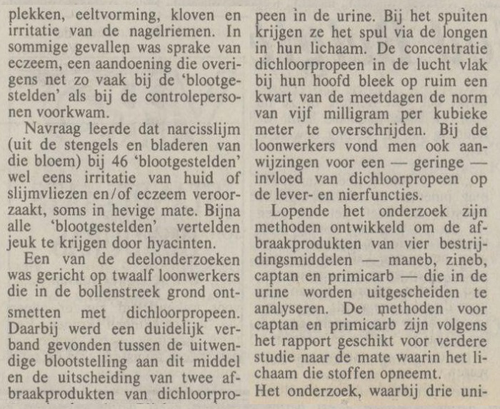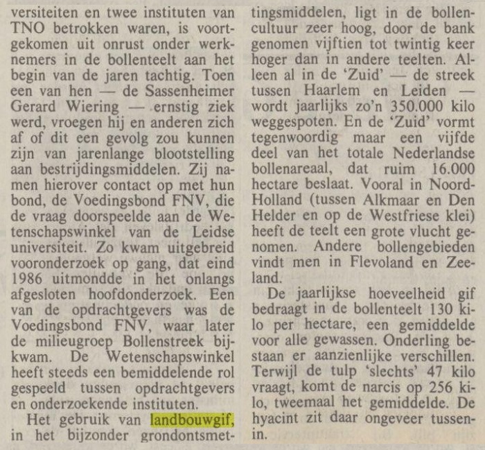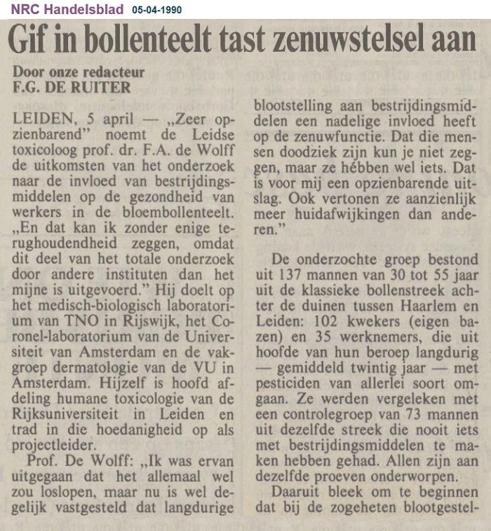 "Gif in bollenteelt tast zenuwstelsel aan 'Dat die mensen doodziek zijn kun je niet zeggen, maar ze hébben wel iets.'". "NRC Handelsblad". Rotterdam, 05-04-1990. Geraadpleegd op Delpher op 06-07-2019,