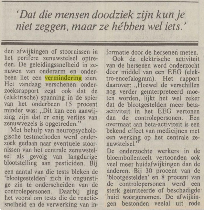 Prof. De Wolff: „Ik was ervan uitgegaan dat het allemaal wel zou loslopen, maar nu is wel degelijk vastgesteld dat langdurige blootstelling aan bestrijdingsmiddelen een nadelige invloed heeft op de zenuwfunctie. Dat die mensen doodziek zijn kun je niet zeggen, maar ze hébben wel iets. Dat is voor mij een opzienbarende uitslag. Ook vertonen ze aanzienlijk meer huidafwijkingen dan anderen.