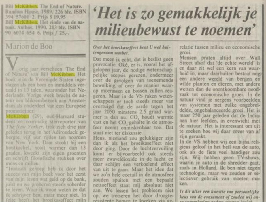 Bill McKibben. The End of Nature. Random House, 1989. 226 blz. ISBN 394 57601 2. Prijs $ 19,95 Bill McKibben. Het einde van de natuur. Anthos, 1990. 213 blz. ISBN 90 6074 654 6. Prijs ƒ 25,-.