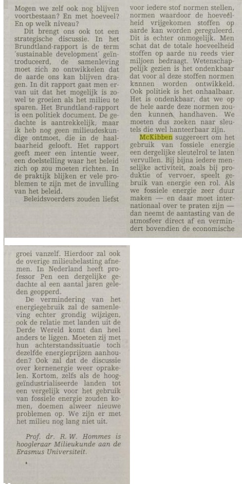 McKibben suggereert om het gebruik van fossiele energie een dergelijke sleutelrol te laten vervullen. Bij bijna iedere menselijke activiteit, zoals bij produktie of vervoer, speelt gebruik van energie een rol. Als we fossiele energie zeer duur maken — en daar moet internationaal over te praten zijn — dan neemt de aantasting van de atmosfeer direct af en vermindert bovendien de economische groei vanzelf. Hierdoor zal ook de overige milieubelasting afnemen. In Nederland heeft professor Pen een dergelijke gedachte al een aantal jaren geleden geopperd.
