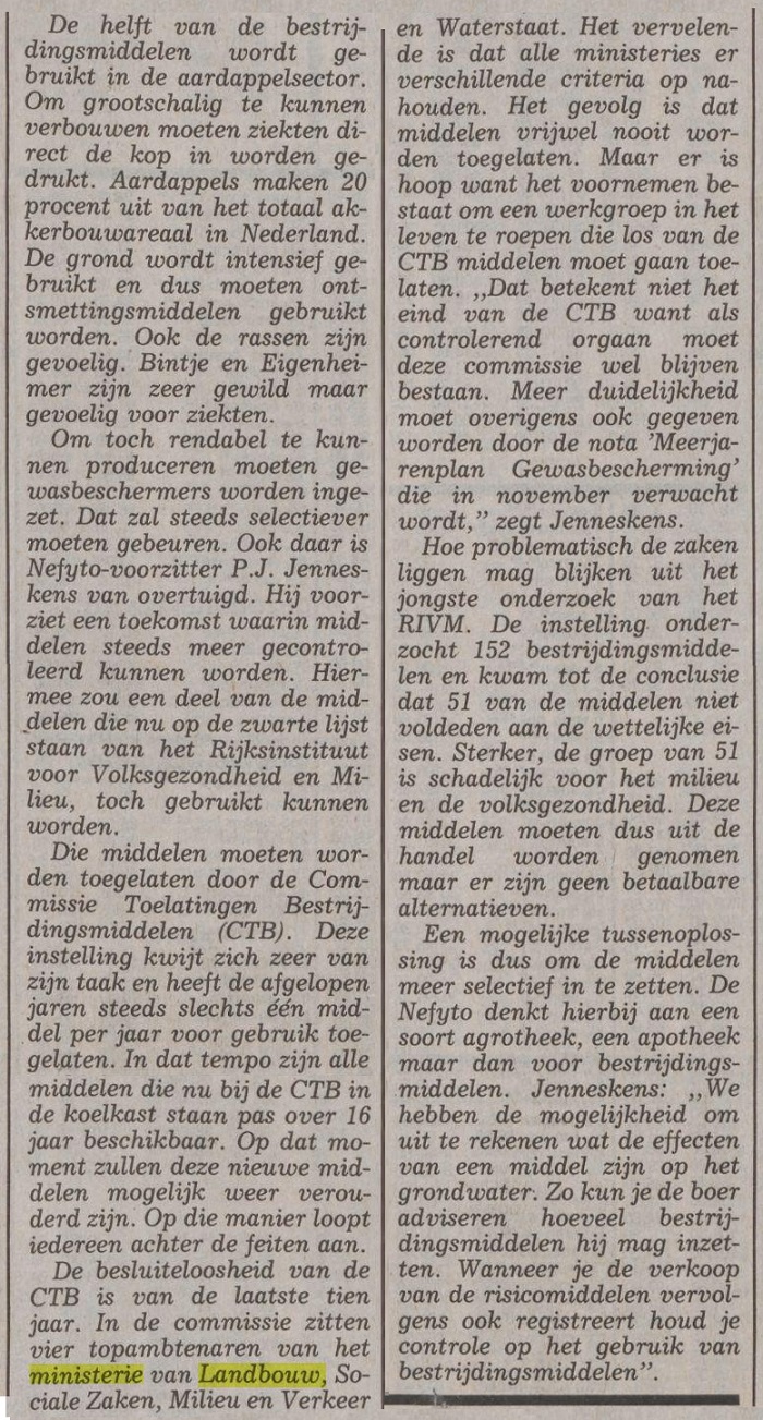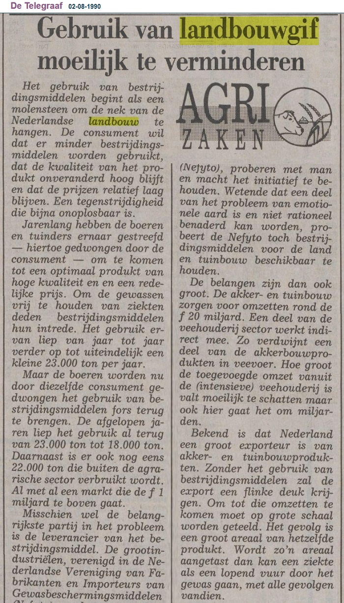 "Gebruik van landbouwgif moeilijk te verminderen AGRI ZAKENEN". "De Telegraaf". Amsterdam, 02-08-1990. Geraadpleegd op Delpher op 02-07-2019, https://resolver.kb.nl/resolve?urn=ddd:010646159:mpeg21:a0596