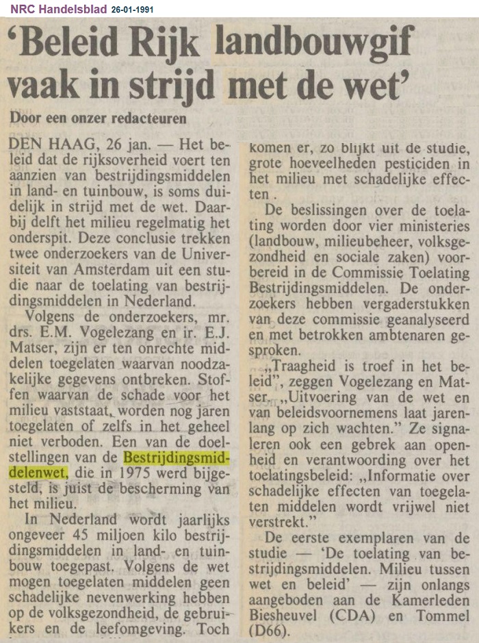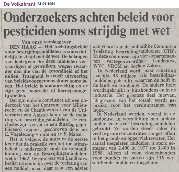 Dat zijn enkele conclusies uit een onderzoek van het Centrum voor Milieurecht en de Chemiewinkel van de Universiteit van Amsterdam naar de toelating van bestrijdingsmiddelen. De conclusies zijn vervat in een dinsdag gepubliceerd rapport, geschreven door mr E. Vogelezang-Stoute en ir E. Matser.