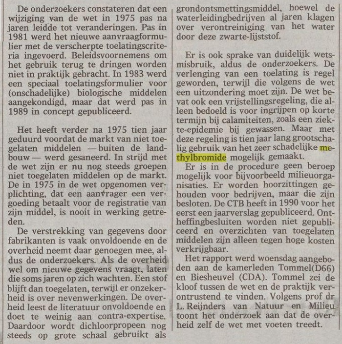 Maar met deze regeling is tien jaar lang grootschalig gebruik van het zeer schadelijke methylbromide mogelijk gemaakt. Er is in de procedure geen beroep mogelijk voor bijvoorbeeld milieuorganisaties. Er worden hoorzittingen gehouden voor bedrijven, maar die zijn besloten. De CTB heeft in 1990 voor het eerst een jaarverslag gepubliceerd.