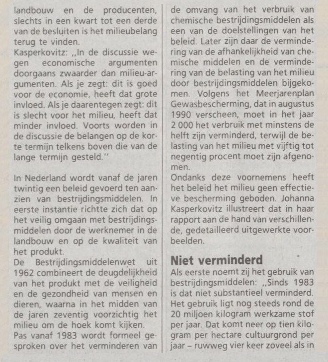 Dit blijkt uit een onderzoek dat Johanna Kasperkovitz van de Katholieke Universiteit Brabant (KUB) in opdracht van de Stichting Natuur en Milieu heeft uitgevoerd. Het onderzoek richtte zich op de totstandkoming van het beleid ten aanzien van bestrijdingsmiddelen en de invloed daarop van de verschillende belangen die in het geding zijn.
