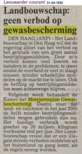 Het beleid heeft de afgelopen jaren het milieu dan ook geen effectieve bescherming geboden. Bij de totstandkoming van het beleid blijken het ministerie van landbouw, het Landbouwschap en de fabrikanten van bestrijdingsmiddelen steeds weer een tè stevige vinger in de pap te hebben.
