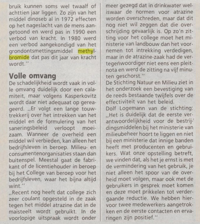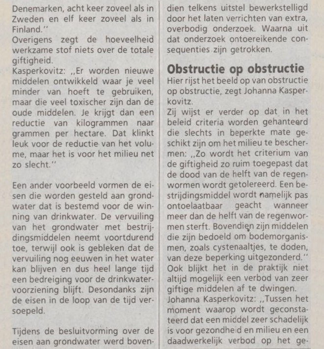 Johanna Kasperkovitz: „Tussen het moment waarop wordt geconstateerd dat een middel zeer schadelijk is voor gezondheid en milieu en een daadwerkelijk verbod op het gebruik kunnen soms wel twaalf of achttien jaar liggen. Zo zijn van het middel dinoseb al in 1972 effecten op het nageslacht van de mens aangetoond en werd pas in 1990 een verbod van kracht. In 1980 werd een verbod aangekondigd van het grondontsmettingsmiddel methylbromide dat pas dit jaar van kracht wordt.'