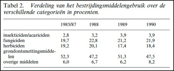 Uit deze tabel blijkt dat de grondontsmettingsmiddelen bijna de helft van het bestrijdingsmiddelengebruik (in tonnen per jaar) uitmaken. Fungiciden en herbiciden hebben elk een aandeel van circa 20 %, terwijl het percentage insekticiden betrekkelijk gering is. Het totale verbruik en verschuivingen in het gebruik worden beïnvloed door het weer. In een warme zomer zijn meer insekticiden nodig, ineen vochtige zomer meer fungiciden.