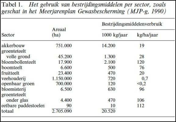 In het Meerjarenplan-Gewasbescherming (MJP-G) van het Ministerie van LNV (1990) is een schatting gemaakt van het bestrijdingsmiddelengebruik in Nederland. Vergeleken met de ons omringende landen is het gebruik in de land- en tuinbouw, uitgedrukt in kg actieve stof/ha, duidelijk hoger dan bijvoorbeeld in Duitsland en Frankrijk. Voor het grootste deel is dit meerverbruik te verklaren uit het veel grotere gebruik van grondontsmet-tingsmiddelen. Verder is het relatief hoge verbruik een gevolg van de kleinschalige bedrijfsstructuur en het zeer intensieve karakter van onze land- en tuinbouw. In Nederland hebben kasteelten en de teelt van aardappelen en bloembollen, die een hoog bestrijdingsmiddelengebruik per hectare kennen, een relatief groot aandeel.