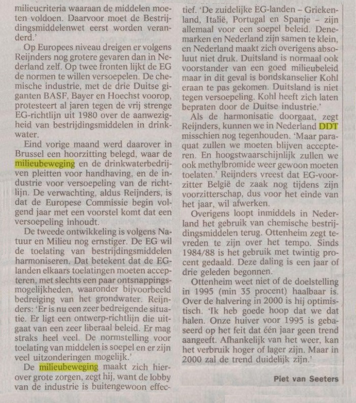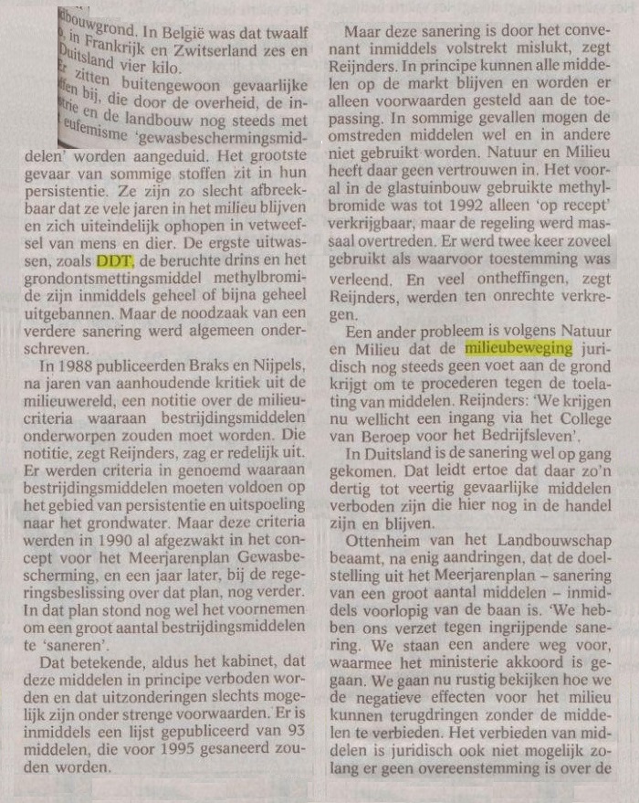 'We mogen blij zijn als we straks DDT buiten ons land weten te houden. De tegenstelling kan niet duidelijker. Beiden hebben het over de uitvoering van het in 1991 vastgestelde Meerjarenplan Gewasbescherming. De rijksoverheid en het bedrijfsleven in de landbouw hebben in juli van dit jaar met enig vertoon een Convenant (officieel: een bestuursovereenkomst) ondertekend om een plan uit te voeren. De belangrijkste doelstelling is dat in 1995 het gebruik van bestrijdingsmiddelen met 35 procent verminderd moet zijn, in vergelijking met de periode 1984/88. In 2000 moet de hoeveelheid gebruikte middelen minstens gehalveerd zijn.