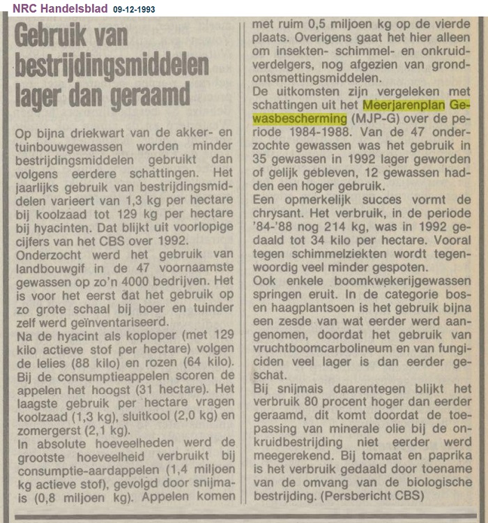 "Gebruik van bestrijdingsmiddelen lager dan geraamd". "NRC Handelsblad". Rotterdam, 09-12-1993. Geraadpleegd op Delpher op 28-06-2019, https://resolver.kb.nl/resolve?urn=KBNRC01:000030898:mpeg21:a0244