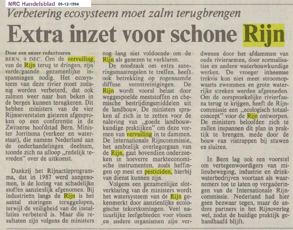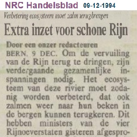 "Verbetering ecosysteem moet zalm terugbrengen Extra inzet voor schone Rijn". "NRC Handelsblad". Rotterdam, 09-12-1994. Geraadpleegd op Delpher op 26-06-2019, https://resolver.kb.nl/resolve?urn=KBNRC01:000030813:mpeg21:a0023