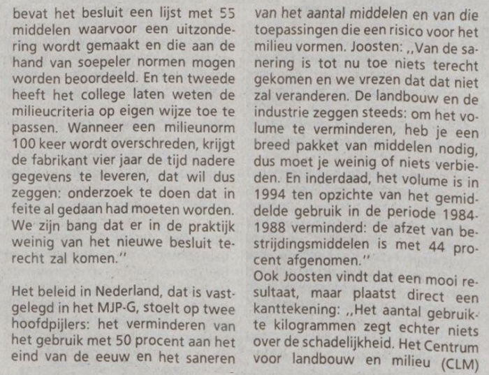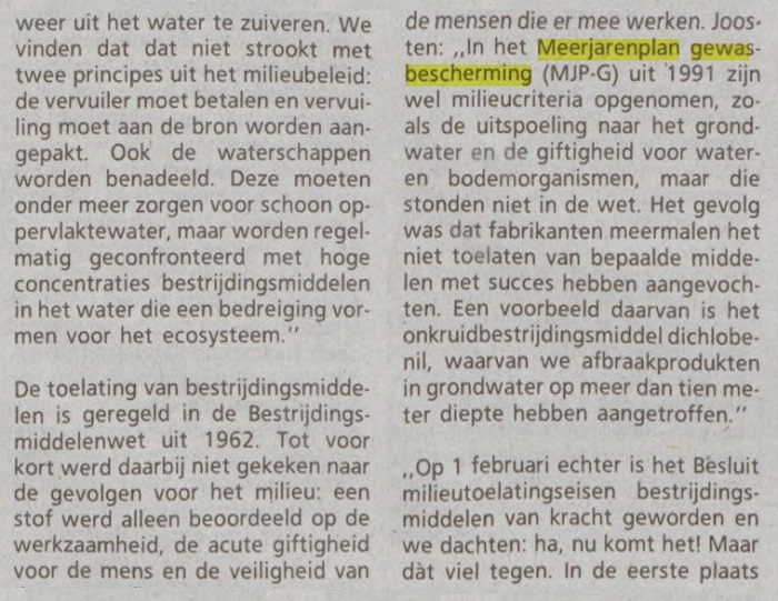 Joosten: „Het gevolg van die eigen koers is, dat stoffen die erkend schadelijk zijn, langer worden toegelaten en dus toegepast dan noodzakelijk en wenselijk is. Zowel de drinkwaterbedrijven als de waterschappen zijn daar de dupe van. Steeds meer bestrijdingsmiddelen en afbraakprodukten daarvan worden op steeds grotere diepte in het grondwater aangetroffen - nu al tot meer dan 30 meter.”