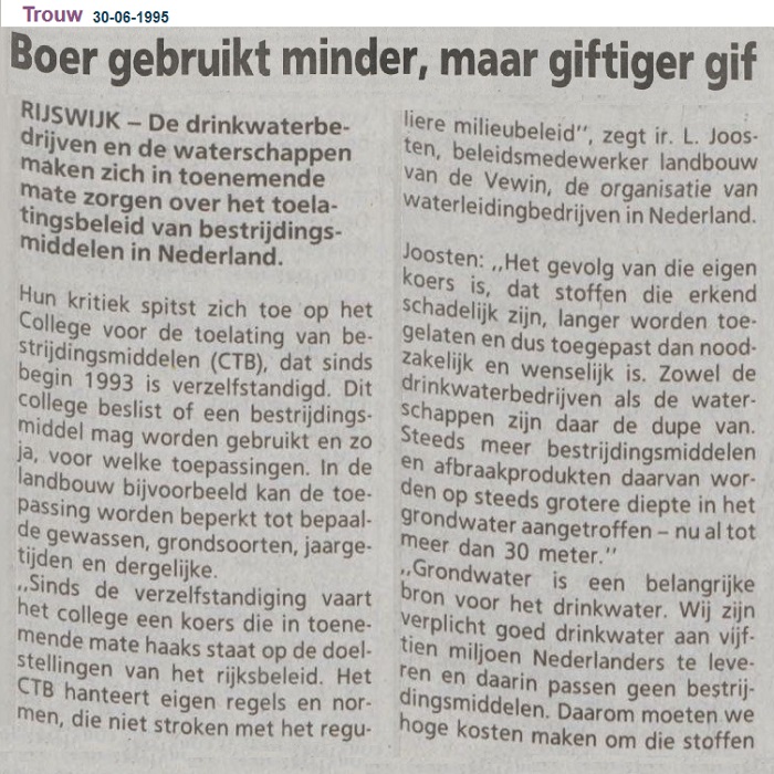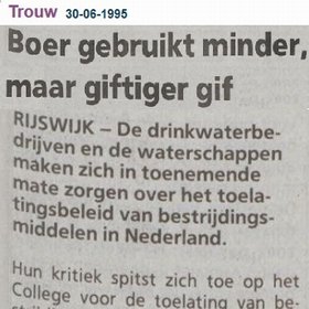 "Boer gebruikt minder, maar giftiger gif door Hans Schmit". "Trouw". Meppel, 30-06-1995. Geraadpleegd op Delpher op 29-06-2019, https://resolver.kb.nl/resolve?urn=ABCDDD:010821702:mpeg21:a0143