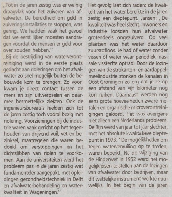 „Tot in de jaren zestig was er weinig draagvlak voor het zuiveren van afvalwater. De bereidheid om geld in zuiveringsinstallaties te stoppen, was gering. We hadden vaak het gevoel dat we eerst lijken moesten aandragen voordat de mensen er geld voor over zouden hebben.” „Bij de bestrijding van waterverontreiniging werd in de eerste plaats gedacht aan rioleringen om het afvalwater zo snel mogelijk buiten de bebouwde kom te brengen. Zo voorkwam je direct contact tussen de mens en zijn uitwerpselen en daarmee besmettelijke ziekten. Ook de ingenieursbureaus hielden zich tot de jaren zestig toch vooral bezig met riolering.