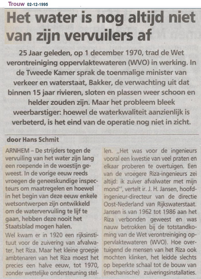 Een van de vroegere Riza-ingenieurs zei altijd: ik zuiver afvalwater met mijn mond”, vertelt ir. J. H. Jansen, hoofdingenieur-directeur van de directie Oost-Nederland van Rijkswaterstaat. Jansen is van 1962 tot 1986 aan het Riza verbonden geweest en was nauw betrokken bij de totstandkoming van de Wet verontreiniging oppervlaktewateren (WVO). Hoe overtuigend de mensen van het Riza ook mochten klinken, het leidde slechts op beperkte schaal tot de bouw van (mechanische) zuiveringsinstallaties.