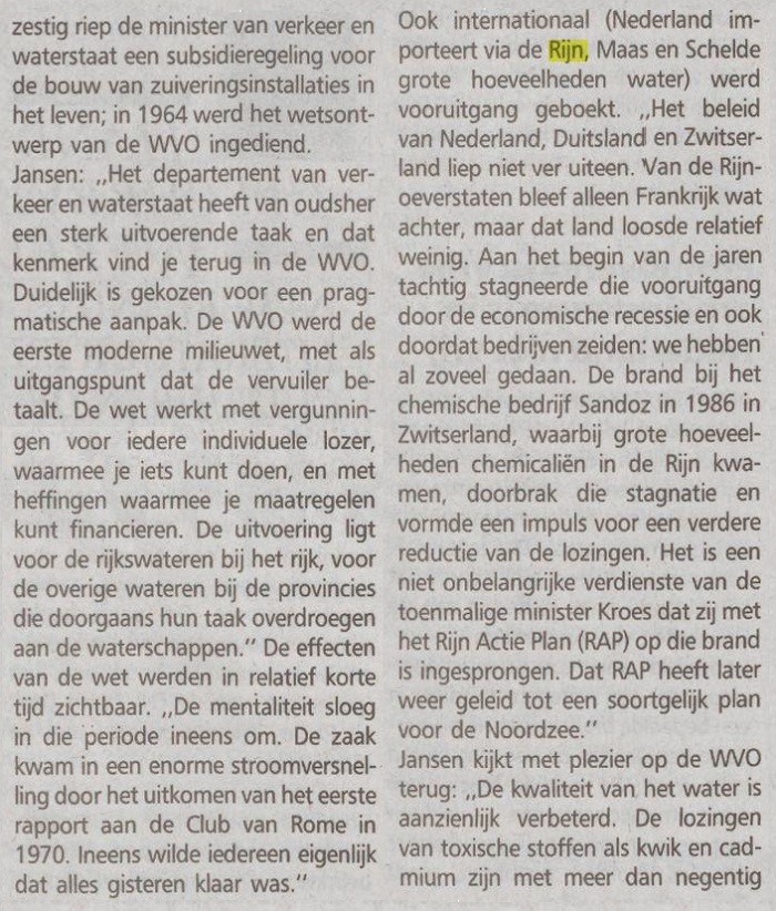 Het is een niet onbelangrijke verdienste van de toenmalige minister Kroes dat zij met het Rijn Actie Plan (RAP) op die brand is ingesprongen. Dat RAP heeft later weer geleid tot een soortgelijk plan voor de Noordzee.”