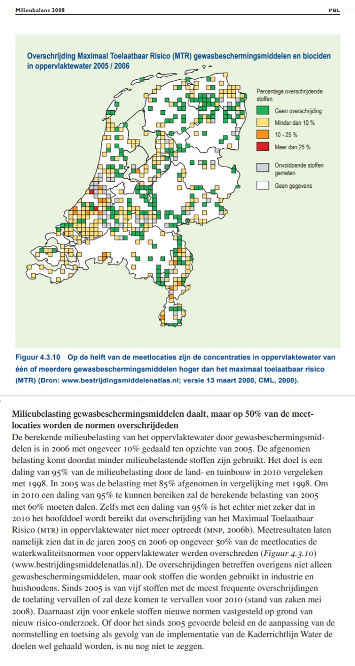 De berekende milieubelasting van het oppervlaktewater door gewasbeschermingsmiddelen is in 2006 met ongeveer 10% gedaald ten opzichte van 2005. De afgenomen belasting komt doordat minder milieubelastende stoffen zijn gebruikt. Het doel is een daling van 95% van de milieubelasting door de land- en tuinbouw in 2010 vergeleken met 1998. In 2005 was de belasting met 85% afgenomen in vergelijking met 1998. Om in 2010 een daling van 95% te kunnen bereiken zal de berekende belasting van 2005 met 60% moeten dalen. Zelfs met een daling van 95% is het echter niet zeker dat in 2010 het hoofddoel wordt bereikt dat overschrijding van het Maximaal Toelaatbaar Risico (MTR) in oppervlaktewater niet meer optreedt (MNP, 2006b). Meetresultaten laten namelijk zien dat in de jaren 2005 en 2006 op ongeveer 50% van de meetlocaties de waterkwaliteitsnormen voor oppervlaktewater werden overschreden (Figuur 4.3.10) (www.bestrijdingsmiddelenatlas.nl). De overschrijdingen betreffen overigens niet alleen gewasbeschermingsmiddelen, maar ook stoffen die worden gebruikt in industrie en huishoudens. Sinds 2005 is van vijf stoffen met de meest frequente overschrijdingen de toelating vervallen of zal deze komen te vervallen voor 2010 (stand van zaken mei 2008). Daarnaast zijn voor enkele stoffen nieuwe normen vastgesteld op grond van nieuw risico-onderzoek. Of door het sinds 2005 gevoerde beleid en de aanpassing van de normstelling en toetsing als gevolg van de implementatie van de Kaderrichtlijn Water de doelen wel gehaald worden, is nu nog niet te zeggen.