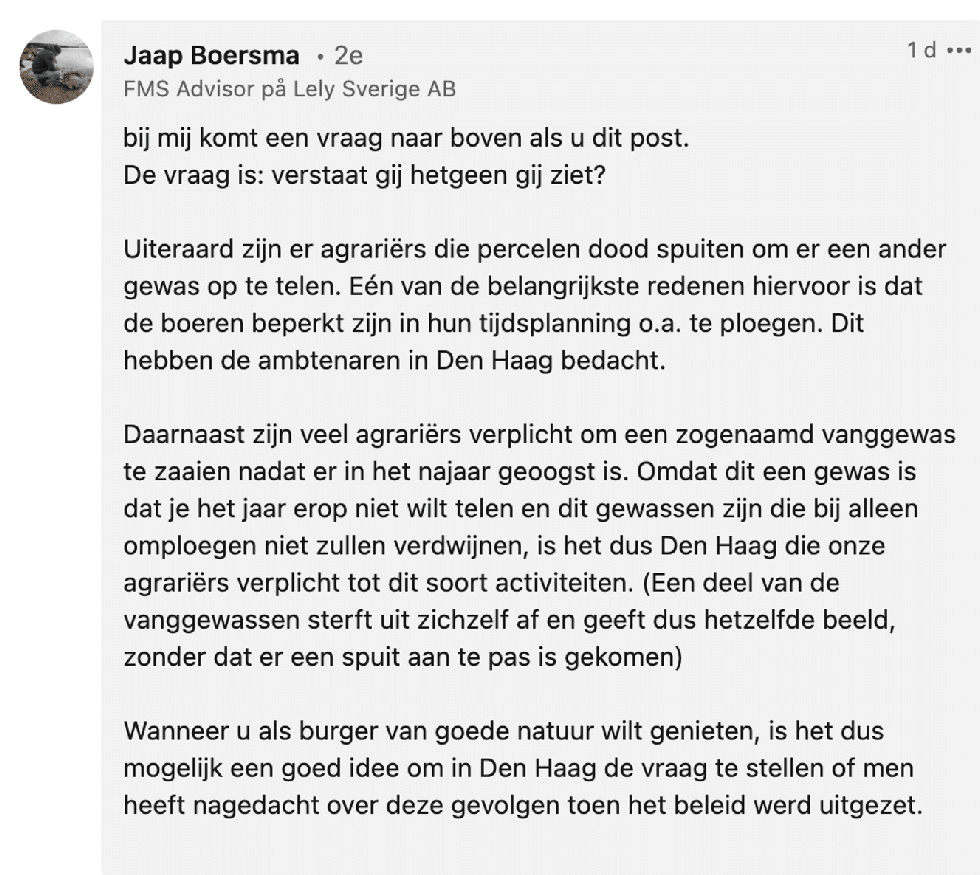 ‘Nederland heeft een snellere omslag nodig naar natuurinclusieve landbouw, zodat de natuur kan herstellen. Met een gezonde bodem, mechanische onkruidbestrijding en een grotere diversiteit van gewassen, krijgen ziektes en plagen minder kans’, aldus Rob van Tilburg, directeur programma’s van Natuur & Milieu. De opstellers van het manifest roepen de overheid op om financiële ondersteuning te bieden aan boeren zodat zij de transitie kunnen maken naar bijvoorbeeld biologische landbouw. Ook moet er beleid komen waarmee de hele voedselketen bijdraagt aan een natuurvriendelijke land- en tuinbouwsector.